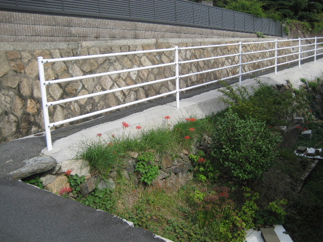 ガードパイプ側は家一軒分の高低差、山側は同等程度の石積みだ。